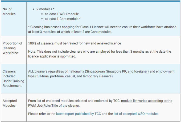 In June 2021, the Tripartite Cluster for Cleaners (TCC) recommended enhanced training to deepen cleaners’ technical skills for better service quality. Core WSQ modules were identified under the Skills Framework for Environmental Services (SFw for ES). The Government accepted these mandatory training requirements to improve safety, productivity, and service delivery. From 31 December 2022, cleaning businesses must ensure all cleaners complete the required Core WSQ modules.
